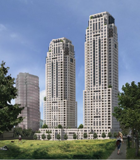 The proposal is to allow for the enactment of a CD-1 By-law which allows for a 48-storey and a 43-storey mixed-use building with a six-storey podium and includes: