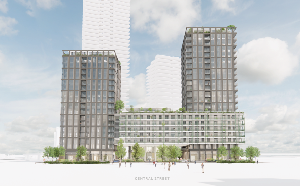 • 22 and 18-storey towers connected by a podium with commercial uses at grade and 363 market rental units above