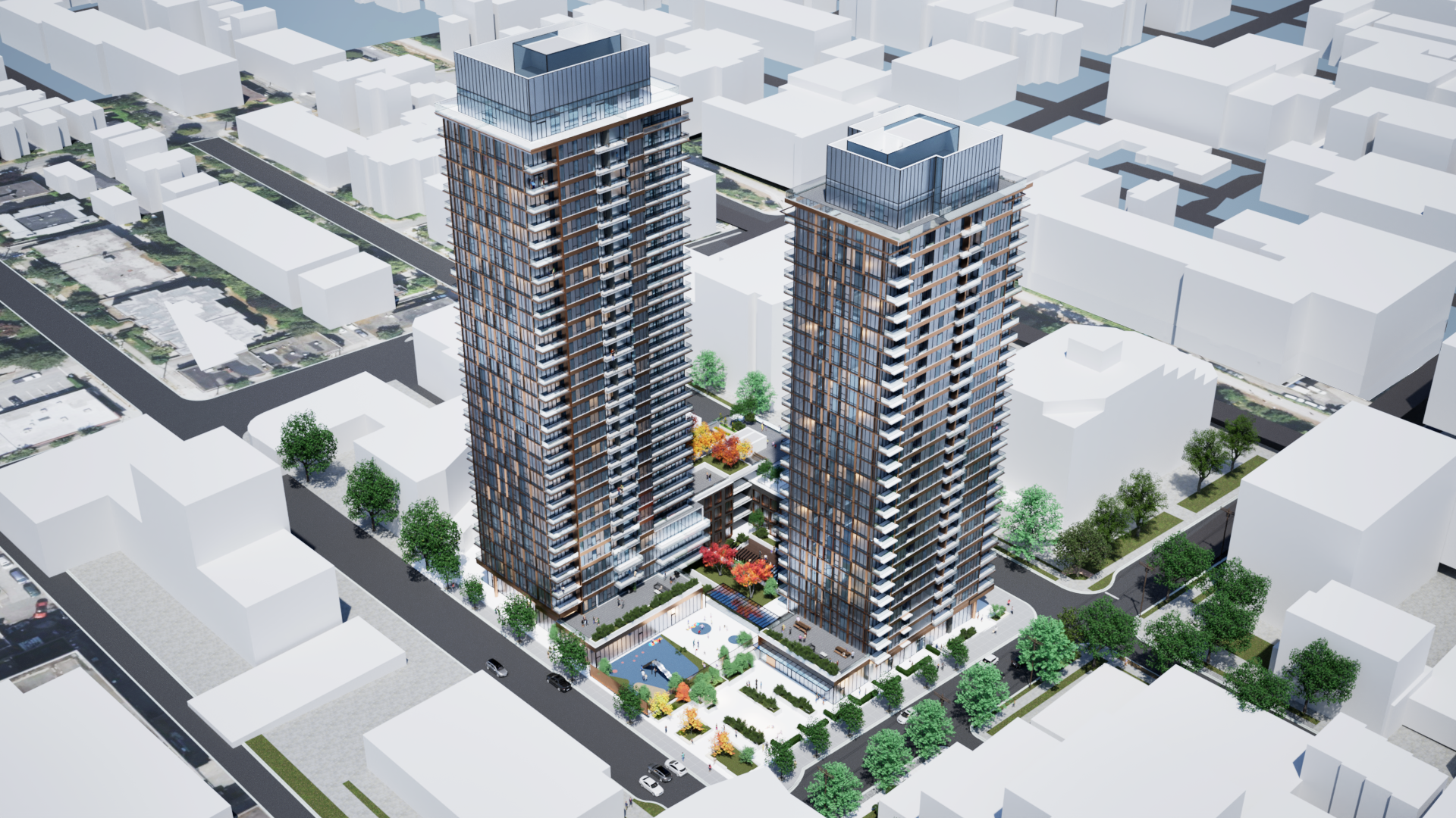 The City of Vancouver has received an application to rezone the subject site from C-3A (Commercial) District to CD-1 (Comprehensive Development) District. The proposal is to allow for the development of a 28-storey and a 29-storey mixed-use building, and includes:
