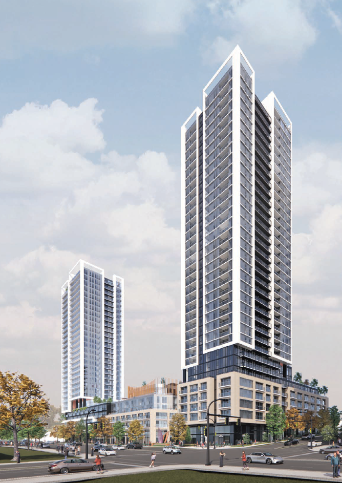 The proposal is for a 34-storey (east tower) and a 29-storey (west tower) mixed-userental building which includes: