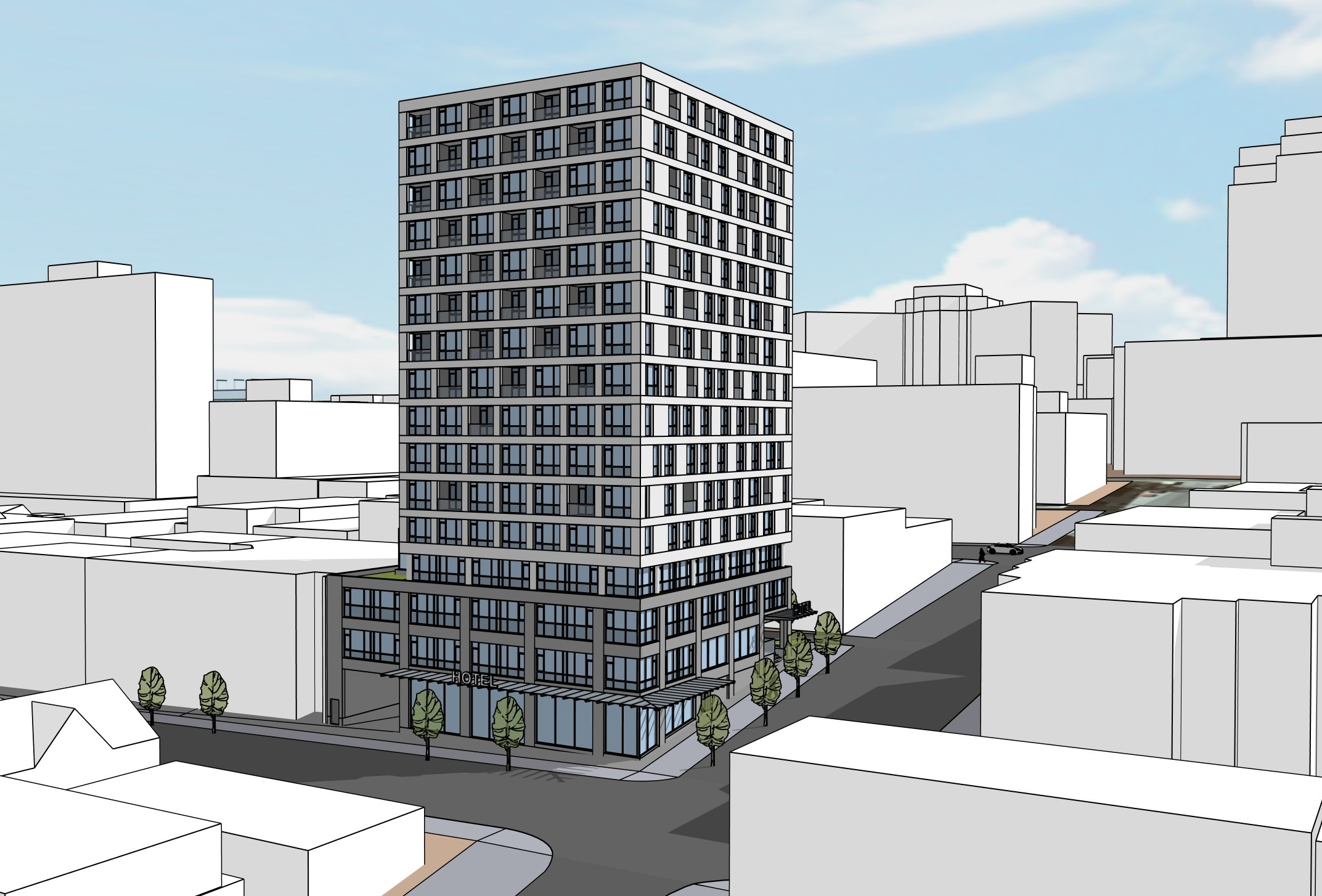 The City of Vancouver has received an application to rezone the subject site from C3-A District to CD-1 (Comprehensive Development) District. The proposal is to allow for the development of a 16-storey hotel building with a four-storey podium and includes: