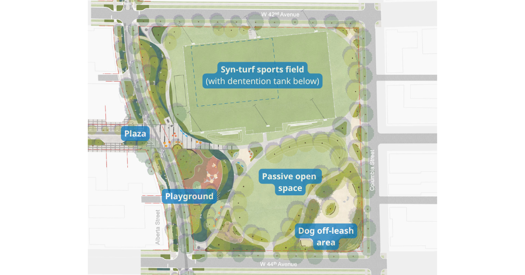 Alberta Street (from West 37th Avenue to 45th Avenue) will be a park-like street, or blue green system, that provides a connection for people and urban wildlife between Queen Elizabeth Park and Columbia Park.
