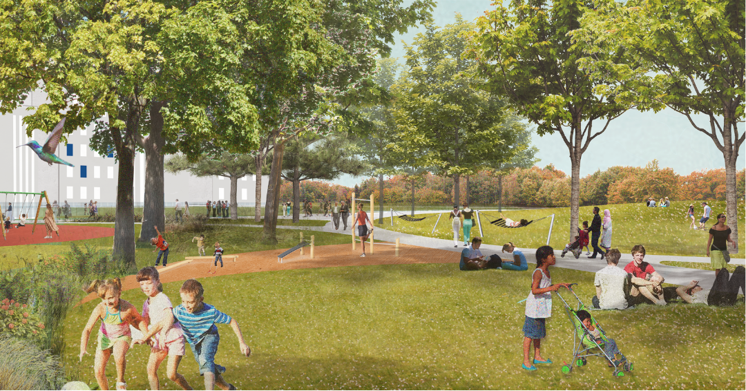 Rendering of the future Columbia Park with spaces for play, fitness, and social connection -