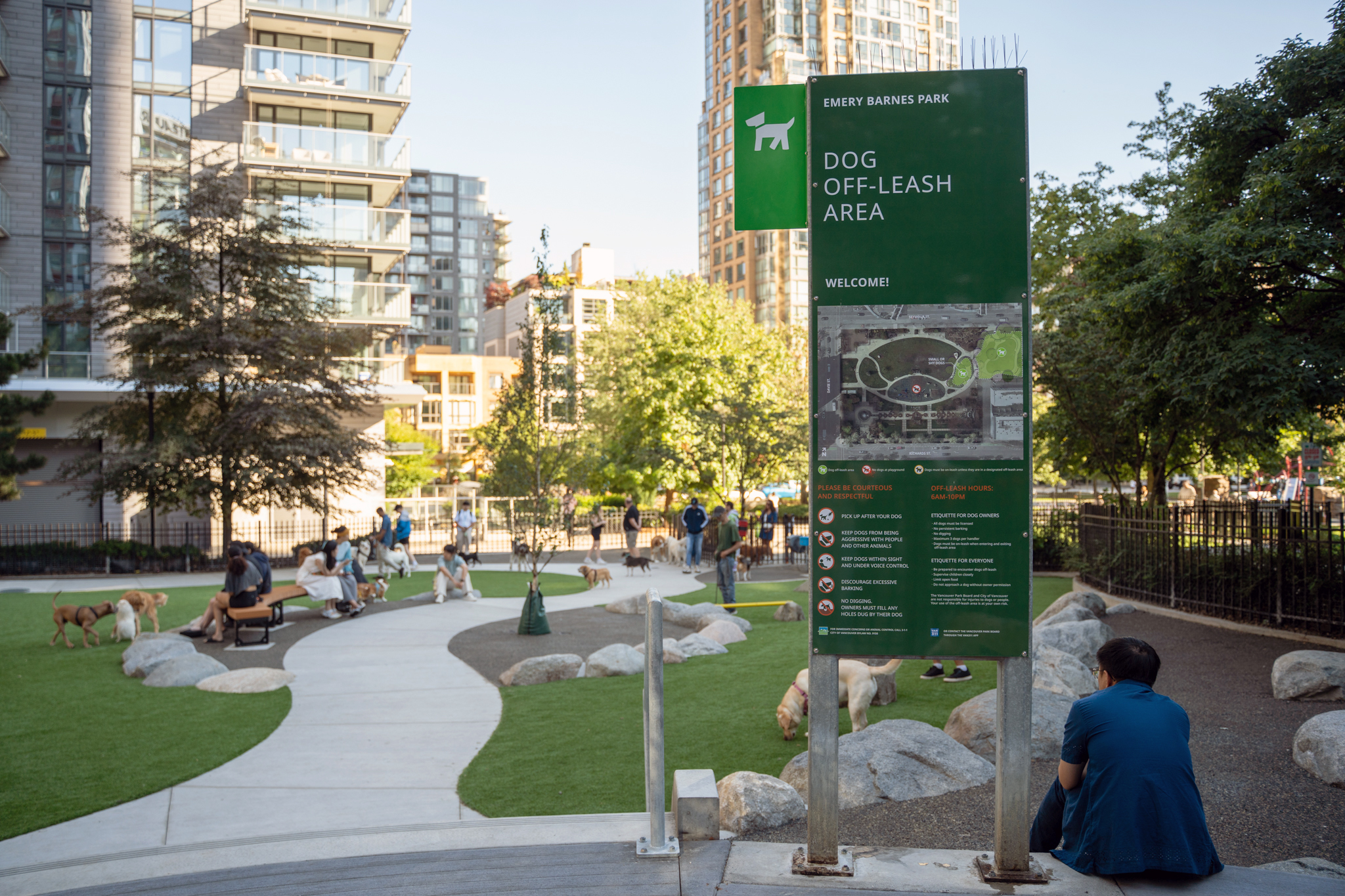 Emery Barnes Park was built in 3 phases. Phase 1 was completed in 2003, phase 2, which included the dog off-leash area, was completed in 2010, and phase 3 was completed in 2012. Since building the off-leash area in 2010, we have adopted the People, Parks and Dogs Strategy. The strategy provides a framework for the next ten years and beyond to deliver well-planned and designed parks that accommodate park users, with and without dogs.