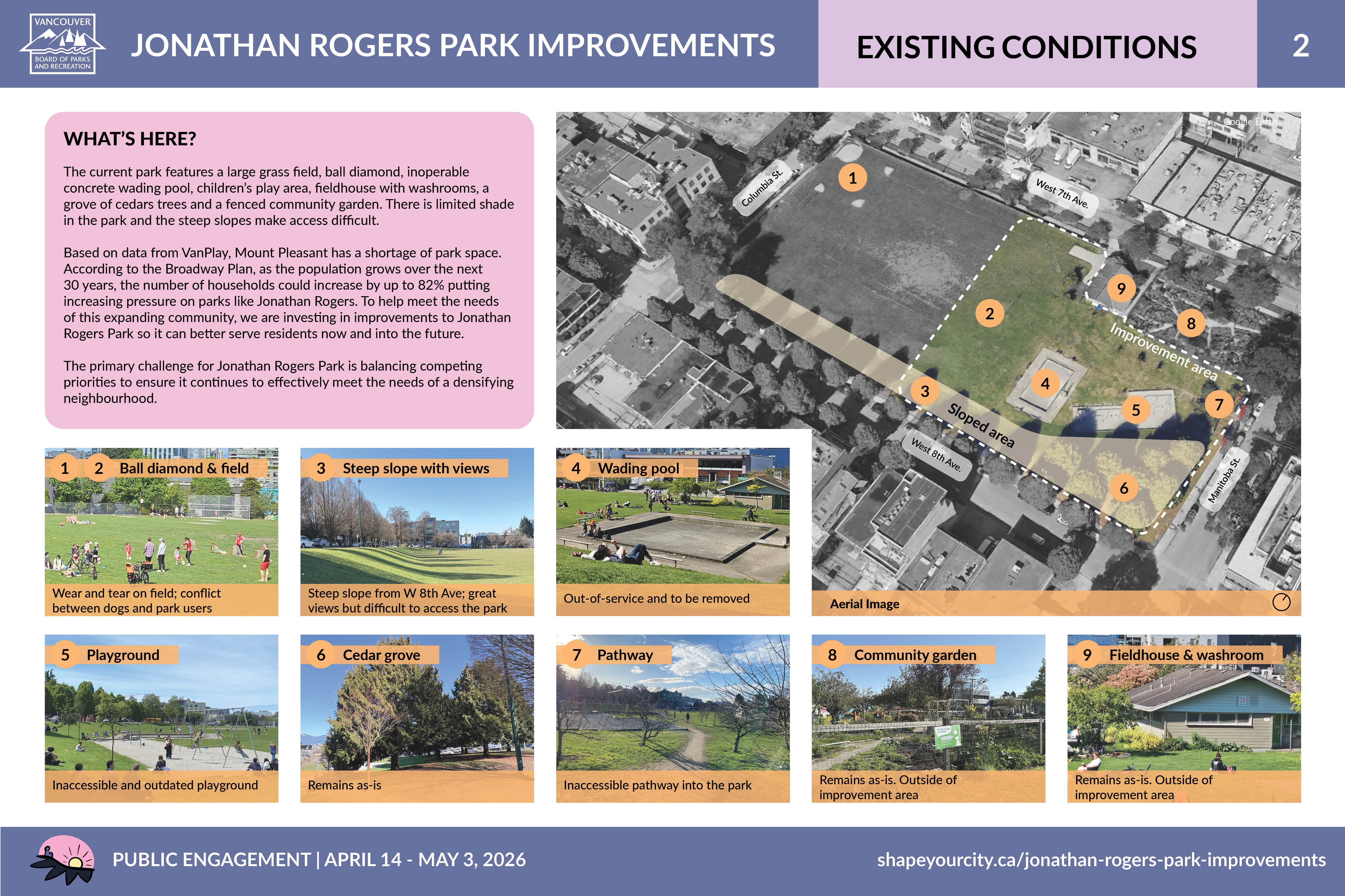 Your input will help us refine and develop a proposed concept plan which will be shared with you and later presented to the Park Board for decision. To learn more about this project, please see our information boards (PDF, 13.3 MB). The survey is open from April 14 until May 3.